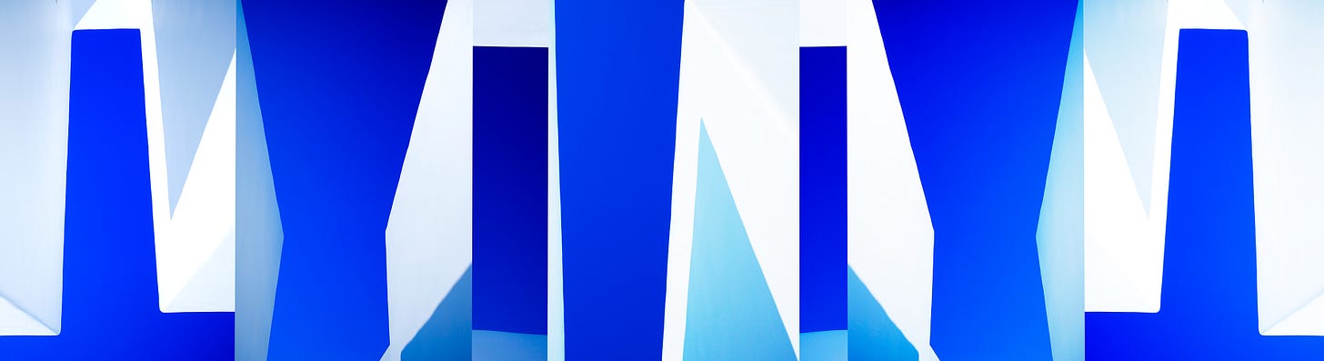Blue is a noun, verb, adjective, key player, inspiration, and medium. Blue is a medium for me in and of itself. Blue is sea, sky, though, feeling. And I feel more deeply as a result of the right blue. Just last night, I printed a large new blue work titled Blue Composition, Leonora’s Way MMXXV. It took many iterations to get the blue right, not too purple, not too green.