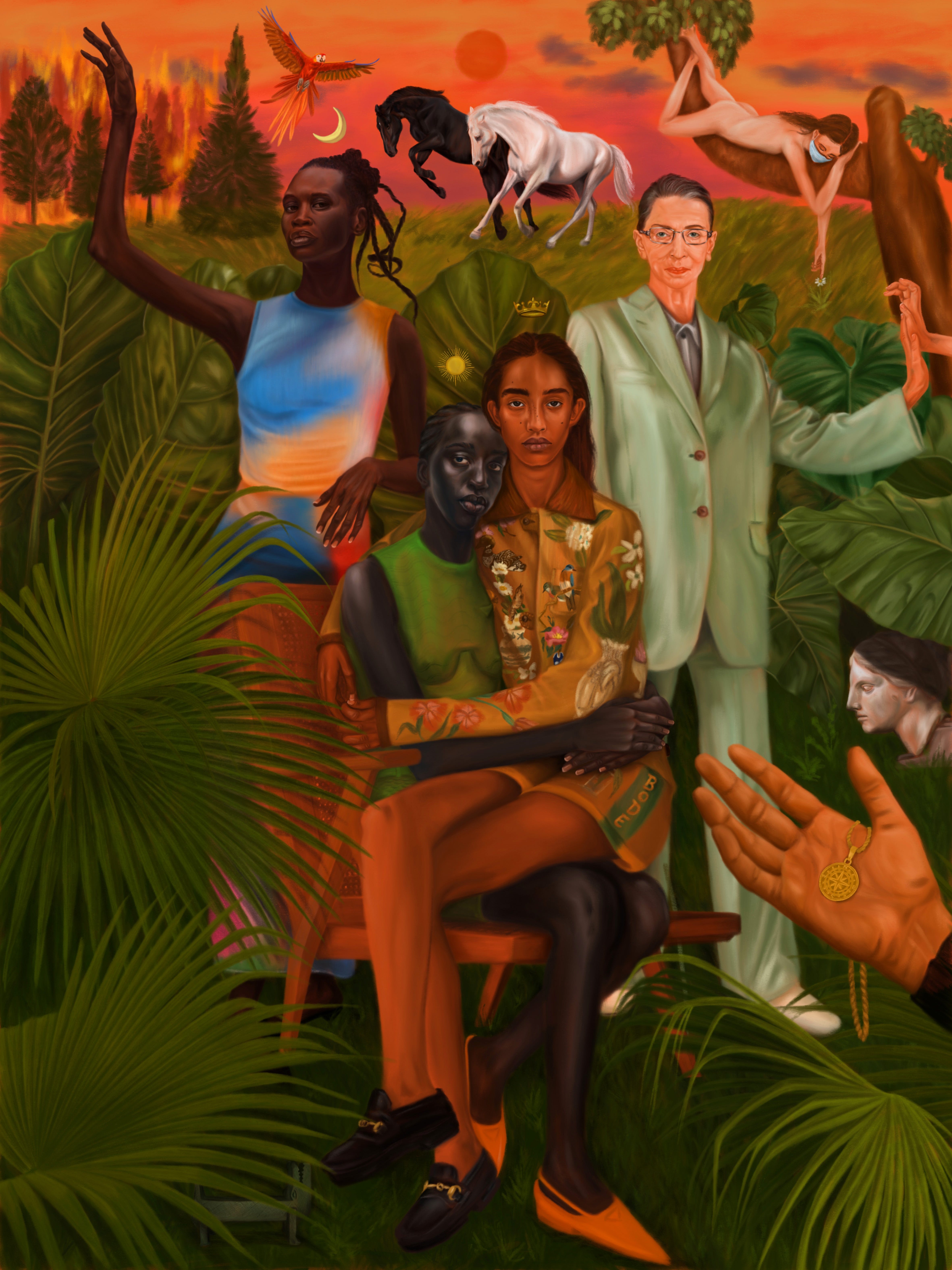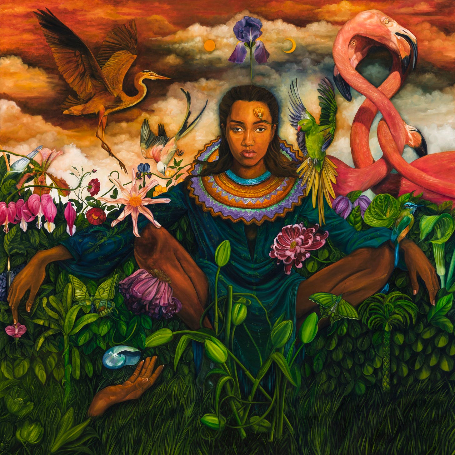 From there, I seek out the elements, the references, and the symbols. This part feels like being a channel for something beyond myself, as though the painting already exists somewhere, and I am simply finding the pieces to bring it into being. The same intuitive feeling guides me—an object, a pattern, or a detail will stand out, calling for inclusion. It’s a process of discovery as much as creation, where my role is as much about listening as it is about deciding.