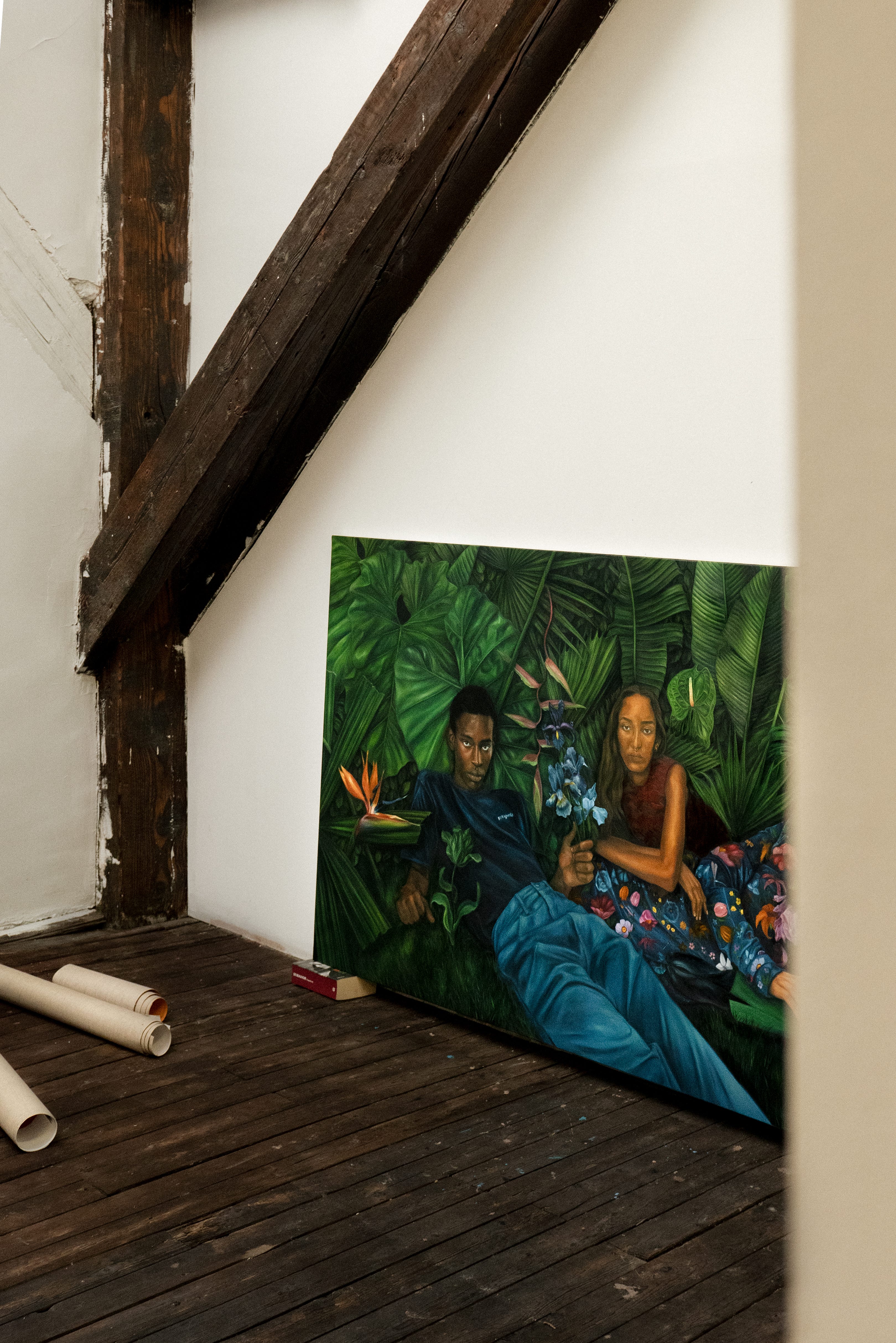 My work exists at the intersection of the personal and the universal, drawing from the surrealism of Latin American magic realism, fashion as a communication tool, and the raw vitality of nature. The women in my paintings confront the viewer with a direct gaze, unyielding—a conversation as much as a declaration. Their presence speaks to identity, resilience, and the evolving role of women in a world where progress feels tenuous, where hard-won rights are being stripped away under the guise of tradition and control.
